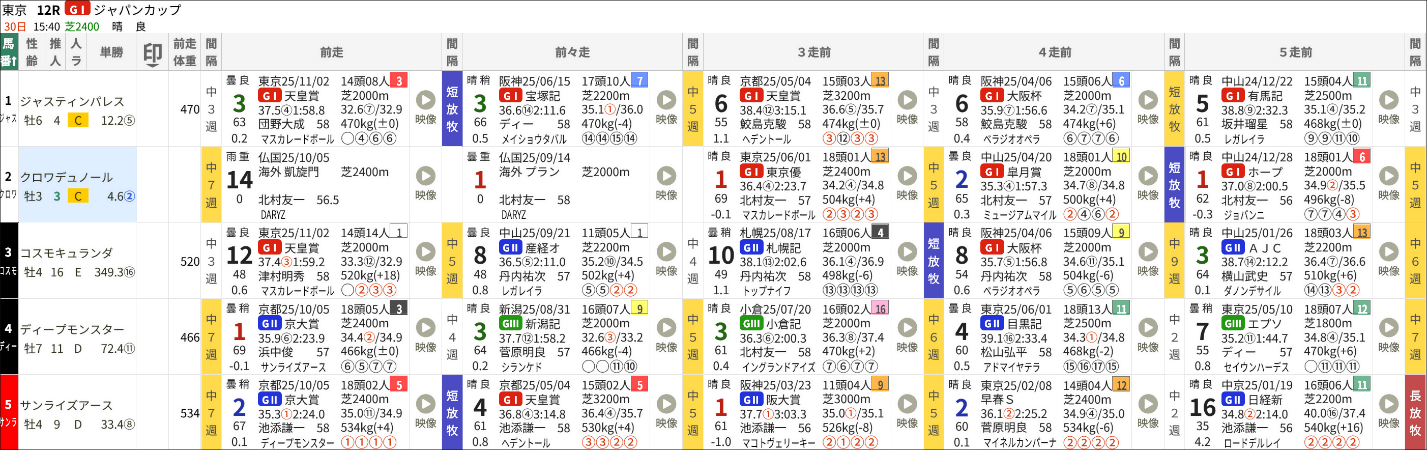 レース間隔における短期放牧は中10~中30週、長期放牧は中31以上。背景色は中5週以上が黄色、中15週以上が青、中30週以上が赤です。